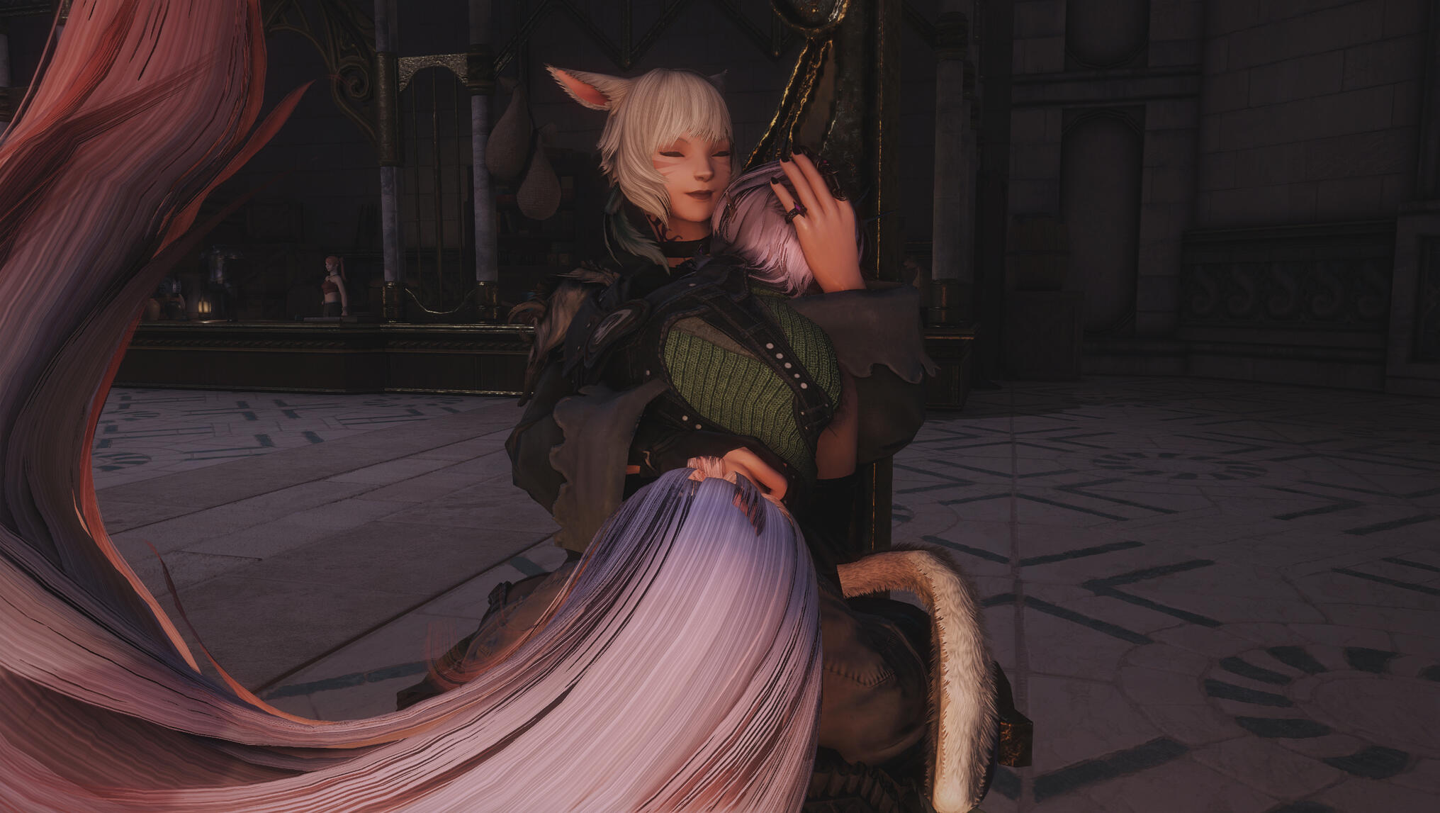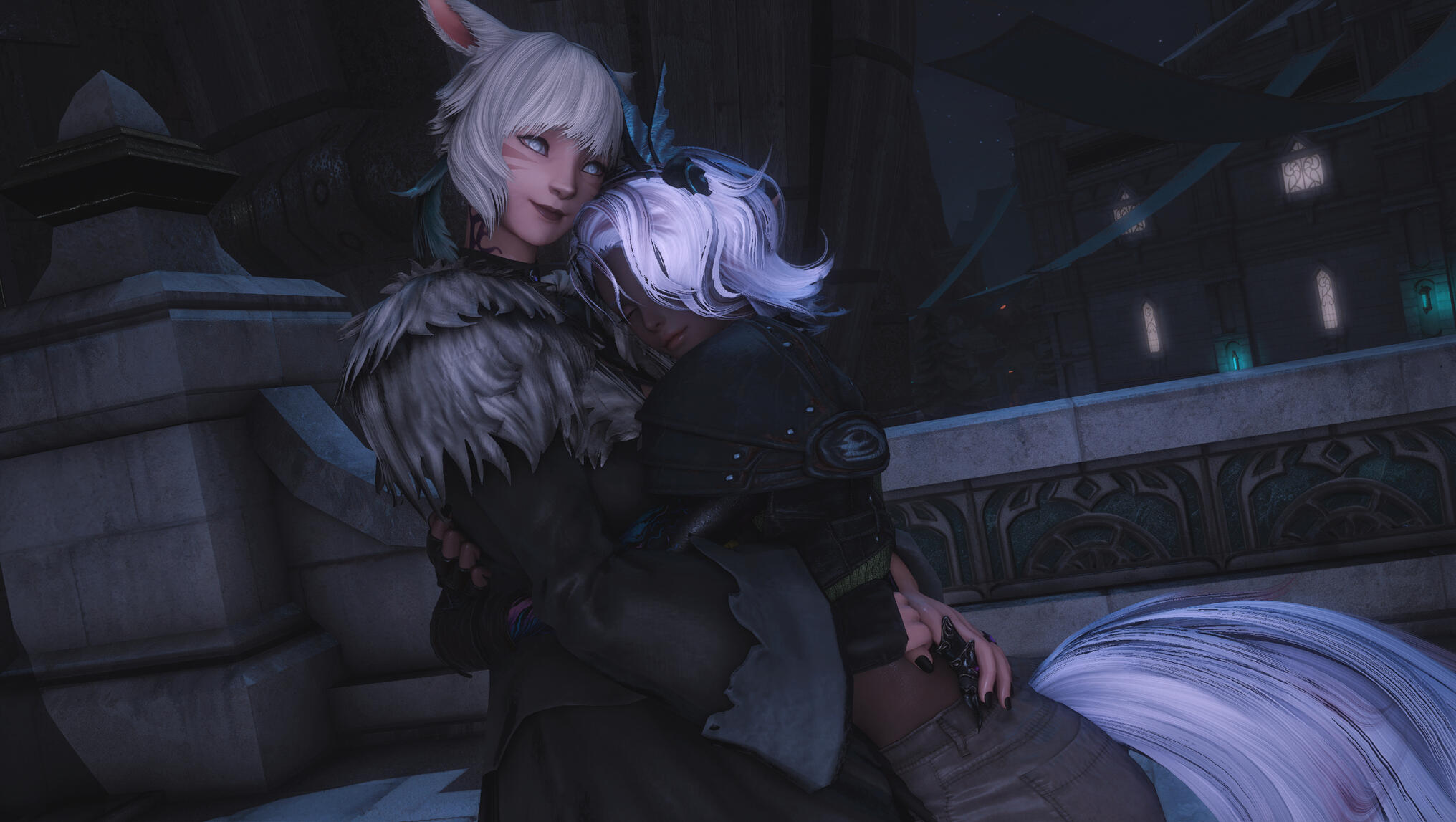 In the quiet days that followed, Matoya’s Relict became less a prison and more a sanctuary of unspoken affection. The spell had taken hold, yet Aldra’s gestures carried a depth no mere magic could conjure. It showed in the little things, the subtle rhythms of their days together.When Y’shtola pored over ancient tomes, Aldra would appear at her side with steaming cups of tea, her silver-pink tail swaying gently as if betraying her eagerness to please. She never said much in those moments, just a shy smile, a lingering touch of her fingers brushing Y’shtola’s hand as she set the cup down, but the warmth behind it needed no words.At night, when exhaustion overtook them both, Aldra would curl beside her without hesitation. Sometimes she drifted off with her head on Y’shtola’s lap, her tail coiled lazily across Y’shtola’s knees, the soft brush of fur soothing as a heartbeat. Other nights she would reach for Y’shtola’s hand, clutching it as though afraid of letting go even in sleep.Her kisses came like rain, scattered and unexpected, yet always tender. A kiss to Y’shtola’s cheek when she least expected it. A kiss to her temple as thanks for some kindness. A hesitant brush against her lips, each one lasting longer than the last, until Y’shtola would draw her close, unable to resist the sweetness that dissolved all her doubts.Even in playful moments, Aldra’s affection bled through. Her tail, once a sign of draconian strength, now served as a mischievous tool, flicking across Y’shtola’s arm or wrapping around her waist as if to claim her in turn. Y’shtola, flustered though she would never admit it, found herself cherishing these moments more than any spell could demand.Each act, whether whispered confessions of love before sleep, or the way Aldra’s gaze lingered as though memorizing every detail, was proof enough. Y’shtola knew she had set the spell too deep, but she also knew this truth: Aldra’s heart had always been hers. The magic had only revealed what was already there.