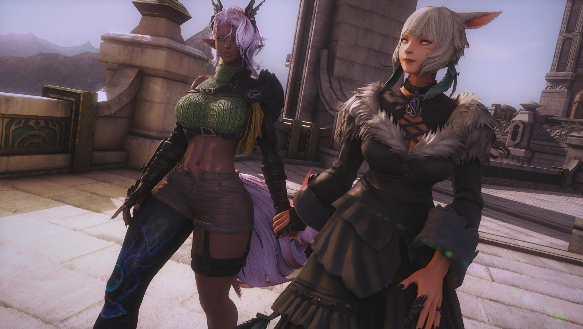 The days in Idyllshire passed softly, as though the bustle of adventurers and merchants melted into nothing more than background noise for Aldra and Y’shtola. They wandered the half-restored ruins hand in hand, pausing to admire the skybridges of ancient stone or to share a moment on the quiet riverbank. To the people of Idyllshire, they looked like any other pair of travelers savoring a reprieve from the world.But Y’shtola’s heart could not rest. In the faintest tremors of the aether, she felt something pulling, searching. It was subtle, distant, yet unmistakable: Alisaie. Her pursuit had not wavered. Every night, when Aldra rested against her shoulder, Y’shtola stared into the shadows, her mind weaving through the possibilities. Alisaie’s persistence was inevitable, but the uncertainty of her arrival gnawed at her.One evening, as the sun painted the ruins in shades of amber and violet, Aldra tugged Y’shtola aside, leading her beneath a broken arch that framed the sky. Her silver-pink hair glowed in the fading light, her mismatched eyes, crimson and violet, watching Y’shtola with quiet determination.“Y’shtola,” Aldra whispered, her voice steady despite the tremor of emotion within it, “I know she’s looking for us. I can feel it. And when she finds me, I don’t want her to see only doubt in my heart. I want her to hear the truth from me, with you beside me.”Y’shtola blinked, taken aback. “You mean… to face her together?”Aldra nodded, her tail curling nervously around her legs. “Yes. If we stand side by side, then no matter what spell she thinks binds me, she will see that I love you. If she doubts me, we will dispel those doubts, together.”Y’shtola’s lips parted, caught between pride and fear. To hear Aldra speak so openly stirred a warmth deep within her, but the thought of letting Alisaie close again threatened to unravel everything she had worked to secure.“Aldra,” she murmured, brushing a strand of hair from her face, “you ask for courage I am not sure I can give. Alisaie does not see our love as we do, she sees only chains.”“Then we’ll show her,” Aldra said firmly, her mismatched gaze unwavering. “We’ll show her that chains have nothing to do with this. That it’s love. It has always been love.”Y’shtola swallowed hard, searching Aldra’s eyes. The crimson glow of her draconian side pulsed faintly, harmonizing with the violet hue shaped by the spell. And yet, what Y’shtola felt in that moment wasn’t the weight of magic, it was the truth of Aldra’s heart laid bare.For the first time since casting her spell, Y’shtola wondered if perhaps Aldra’s love truly didn’t need binding at all.