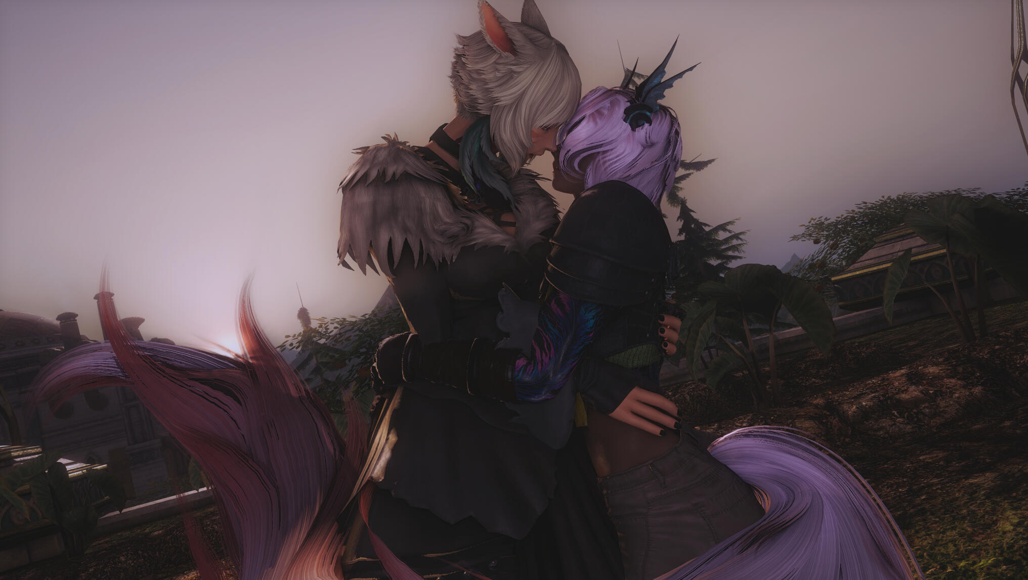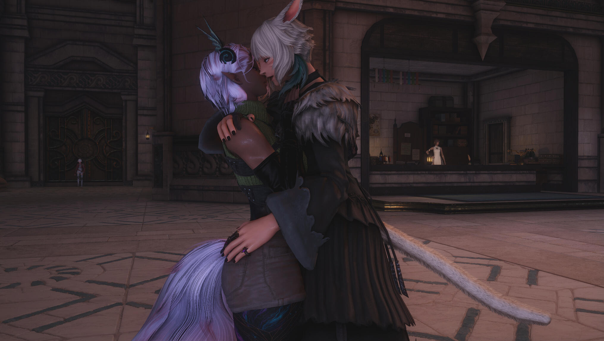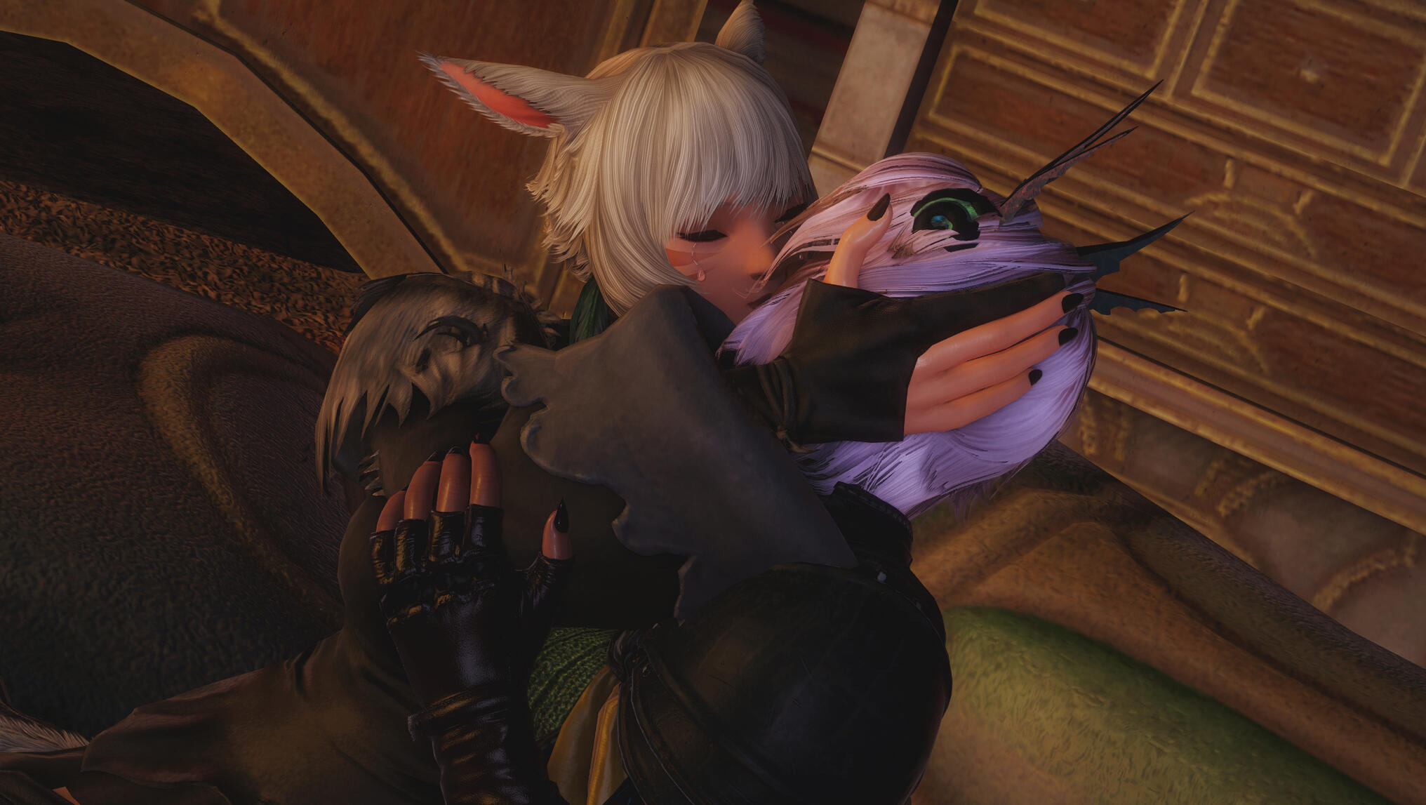 “Y’shtola… these months in the Relict, when it was only you and I… they opened something in me I never thought I’d bare. I’ve fought against myself, against the pull of what you’ve given me. But every time I tried to resist, I realized it was only because I was afraid of the depth of my own feelings.”She lifted her hand to Y’shtola’s cheek, thumb brushing gently over her skin. “I love you. Not because of the spell. Not because of what it does to me. I love you, because it has always been you, since the very first moment. If you must, cast it again, cast it fully. Let it bind me. I will accept it. Gladly. Because my heart already belongs to you.”Without waiting for an answer, Aldra leaned in, closing the space between them. Her lips pressed to Y’shtola’s in a deep, lingering kiss, her determination poured into that single act. The silver-pink shimmer of her tail shifted faintly in the dim light, as though her body itself responded to her resolve.Y’shtola’s hands hovered for a moment, caught between tenderness and the weight of her power, before finally pulling Aldra into her arms. A single tear slipped down her cheek as she kissed her back, fiercely, almost desperately, realizing that Aldra’s willingness was not surrender, but devotion.
