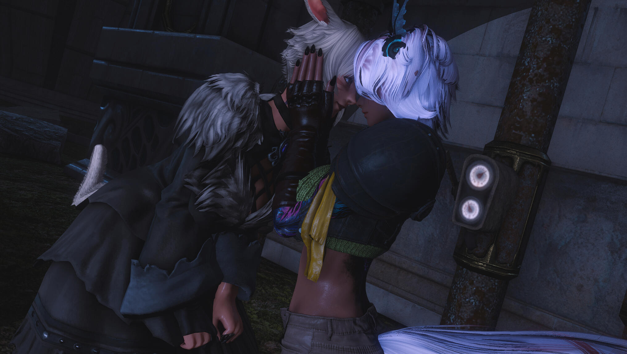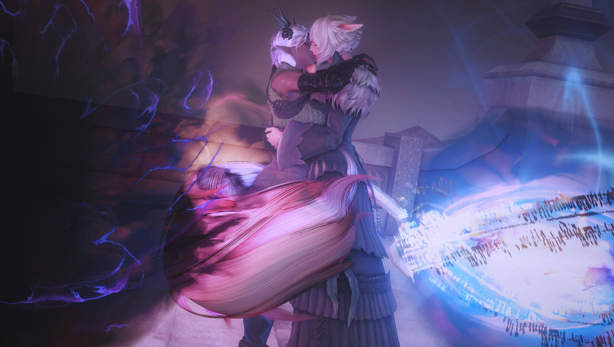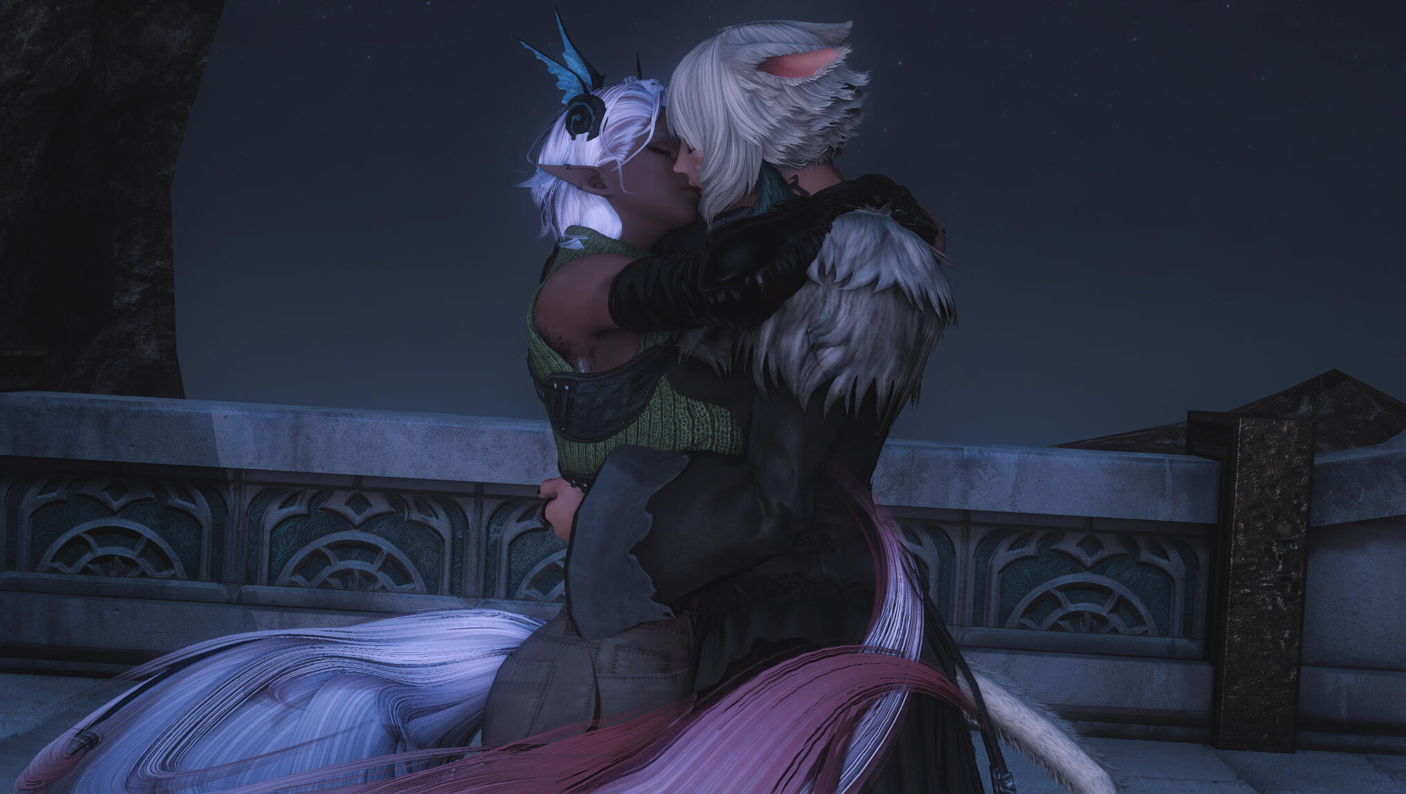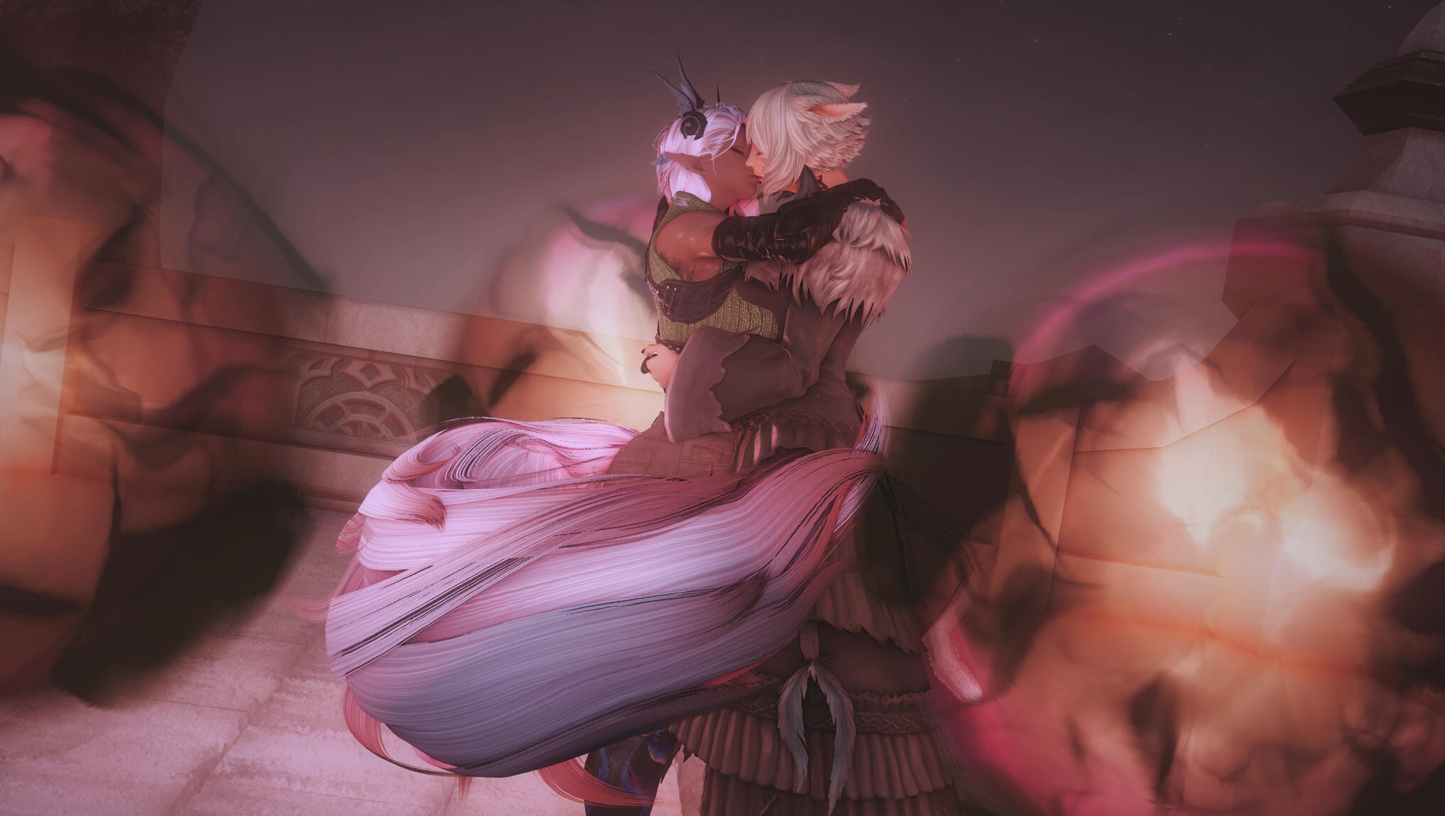 “Y’shtola… these months in the Relict, when it was only you and I… they opened something in me I never thought I’d bare. I’ve fought against myself, against the pull of what you’ve given me. But every time I tried to resist, I realized it was only because I was afraid of the depth of my own feelings.”She lifted her hand to Y’shtola’s cheek, thumb brushing gently over her skin. “I love you. Not because of the spell. Not because of what it does to me. I love you, because it has always been you, since the very first moment. If you must, cast it again, cast it fully. Let it bind me. I will accept it. Gladly. Because my heart already belongs to you.”Without waiting for an answer, Aldra leaned in, closing the space between them. Her lips pressed to Y’shtola’s in a deep, lingering kiss, her determination poured into that single act. The silver-pink shimmer of her tail shifted faintly in the dim light, as though her body itself responded to her resolve.Y’shtola’s hands hovered for a moment, caught between tenderness and the weight of her power, before finally pulling Aldra into her arms. A single tear slipped down her cheek as she kissed her back, fiercely, almost desperately, realizing that Aldra’s willingness was not surrender, but devotion.
