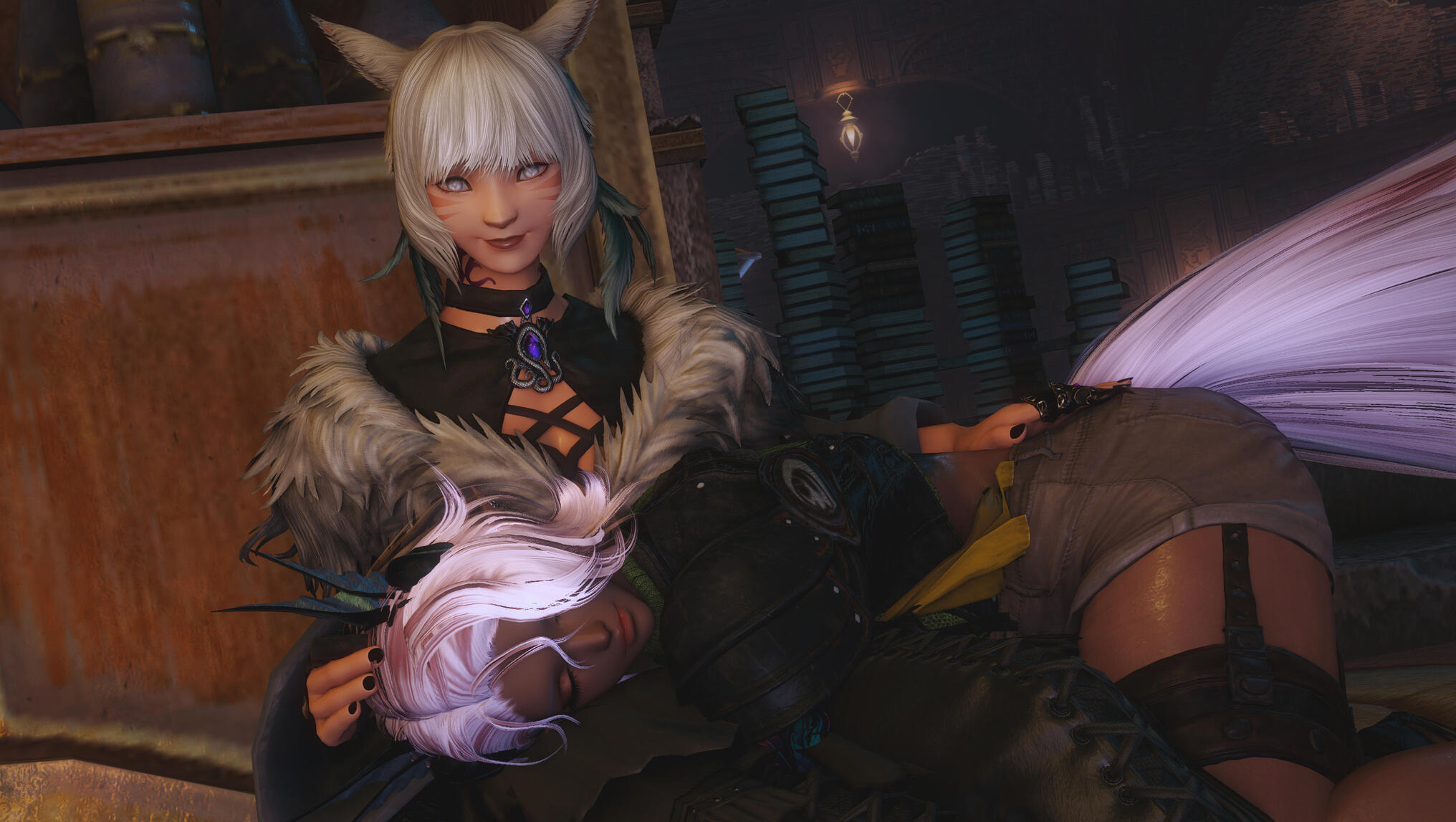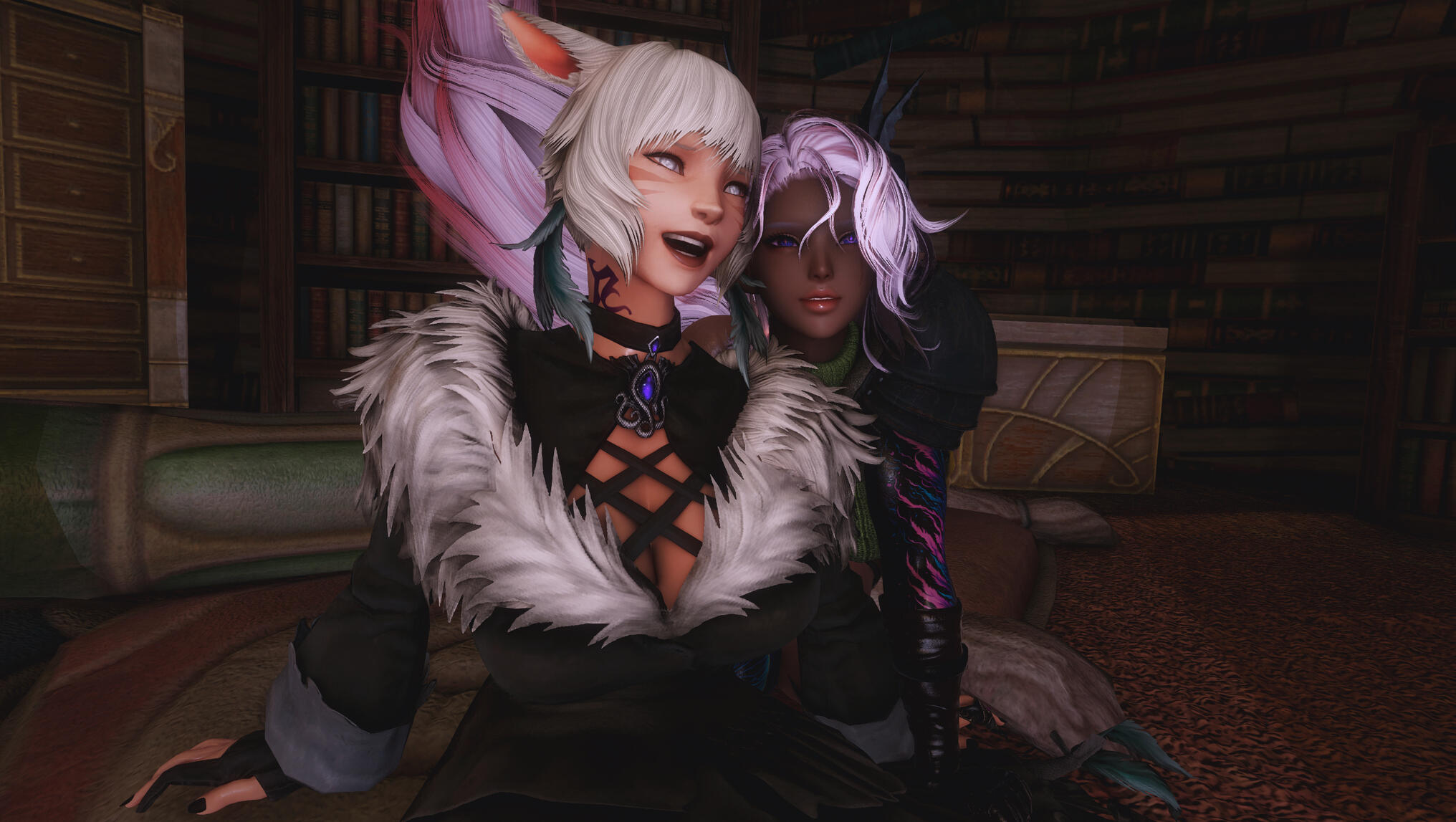 In the quiet days that followed, Matoya’s Relict became less a prison and more a sanctuary of unspoken affection. The spell had taken hold, yet Aldra’s gestures carried a depth no mere magic could conjure. It showed in the little things, the subtle rhythms of their days together.When Y’shtola pored over ancient tomes, Aldra would appear at her side with steaming cups of tea, her silver-pink tail swaying gently as if betraying her eagerness to please. She never said much in those moments, just a shy smile, a lingering touch of her fingers brushing Y’shtola’s hand as she set the cup down, but the warmth behind it needed no words.At night, when exhaustion overtook them both, Aldra would curl beside her without hesitation. Sometimes she drifted off with her head on Y’shtola’s lap, her tail coiled lazily across Y’shtola’s knees, the soft brush of fur soothing as a heartbeat. Other nights she would reach for Y’shtola’s hand, clutching it as though afraid of letting go even in sleep.Her kisses came like rain, scattered and unexpected, yet always tender. A kiss to Y’shtola’s cheek when she least expected it. A kiss to her temple as thanks for some kindness. A hesitant brush against her lips, each one lasting longer than the last, until Y’shtola would draw her close, unable to resist the sweetness that dissolved all her doubts.Even in playful moments, Aldra’s affection bled through. Her tail, once a sign of draconian strength, now served as a mischievous tool, flicking across Y’shtola’s arm or wrapping around her waist as if to claim her in turn. Y’shtola, flustered though she would never admit it, found herself cherishing these moments more than any spell could demand.Each act, whether whispered confessions of love before sleep, or the way Aldra’s gaze lingered as though memorizing every detail, was proof enough. Y’shtola knew she had set the spell too deep, but she also knew this truth: Aldra’s heart had always been hers. The magic had only revealed what was already there.
