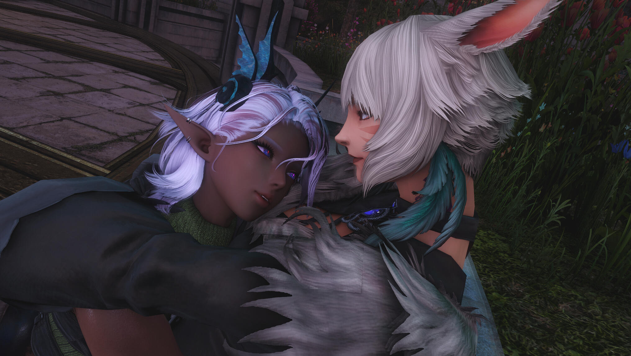 Beneath the ivy-hung archways of Idyllshire, Aldra’s breath came unevenly, not from battle but from the weight pressing against her heart. The ruins around them hummed with the sound of life rebuilt, but in this quiet place, the world narrowed until there was only her and Y’shtola.She reached out, fingers trembling as they brushed Y’shtola’s cheek, silver-blue giving way to silver-pink in the flicker of her tail behind her. Her mismatched eyes, crimson and violet, caught the evening light as she spoke with a voice soft but unshakable.“Y’shtola… I need you to know. This isn’t sudden, nor born from the spell alone. I have loved you for so long, longer than I dared admit to myself. Since the day you freed me from Castrum Centri, when I first felt the weight of your hand pulling me into freedom, I have loved you. When Ul’dah turned red with betrayal during the Bloody Banquet, I came to your side without hesitation, because my heart already belonged to you then, even if I couldn’t name the feeling.”Her hand lingered, thumb brushing tenderly along Y’shtola’s jaw.“I was there when you were pulled from the Lifestream, when your sister helped me bring you back. I swore then that I would never let you face that abyss alone again. I was there when Zenos struck you down in Rhalgr’s Reach, when your breath faltered and blood stained your lips, and I mended you with trembling hands, fearing every second I might lose you.”Her voice broke, but she pressed on.“When you and the Scions were lost to the First shard, I did everything in my power to bring you all back. And when I finally became one of you, it was because you believed in me, you gave me a name, Aldra Saeyris. You gave me more than a place. You gave me myself. And after Endsinger fell, when we disbanded, I realized the truth that had haunted me all along. My heart has always been yours. Always.”Her lips quivered with the words unspoken for years, and tears pricked her eyes. “I didn’t understand the emotions then, how they burned, how they softened, but because of you, and because of Alisaie guiding me to see it, I learned what love truly is. It’s this. You. Only you.”Y’shtola’s hands hovered in the space between them, caught between power and longing, between the scholar who had woven a spell to claim and the woman who had yearned all along to be loved. For a moment, her breath trembled with doubt. Should she finish what she began, let the spell root deeper, binding Aldra until her devotion could never be questioned? Or should she stop now, honor the confession laid bare, and let their love stand without sorcery?Aldra leaned in before the choice could steal her courage. Her lips found Y’shtola’s, deep and certain, pouring her devotion into that single act. When she pulled back, her gaze was unwavering.“If you must cast it again, I will accept it. Gladly. Because my heart is already bound to you. Nothing can change that.”Y’shtola’s breath caught, and at last her resolve broke. A tear traced down her cheek as she drew Aldra into her arms, kissing her back with a desperation that was both tenderness and possession. Her mind still churned, spell or no spell, obsession or devotion, but Aldra’s voice echoed through her heart, dissolving her fear.And as Idyllshire’s lanterns lit one by one, Aldra rested against her, at peace for the first time, willing to accept whatever path Y’shtola chose, because to her, it was love, and love alone.